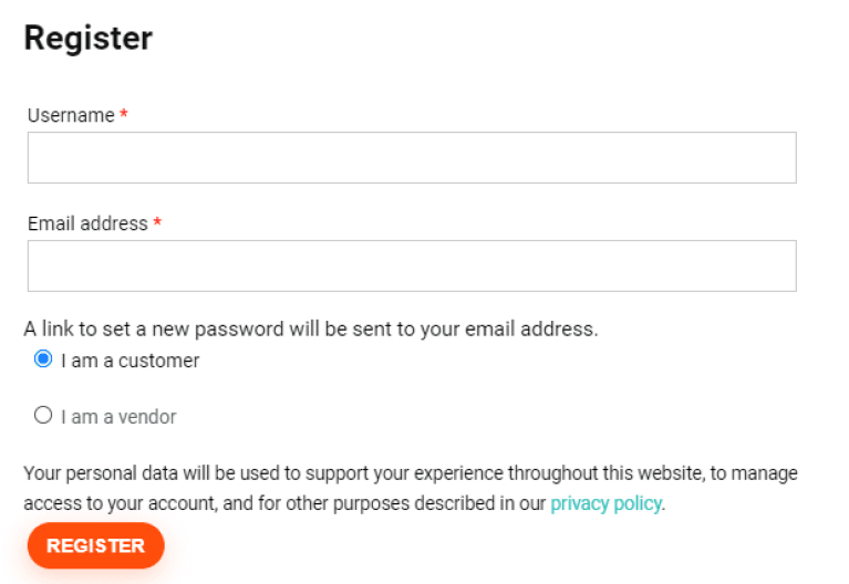 2. Fill in the fields under the “Register” section. Then click on “I am a vendor” and fill in the fields that pop up. Then click on the “Register” button at the bottom.