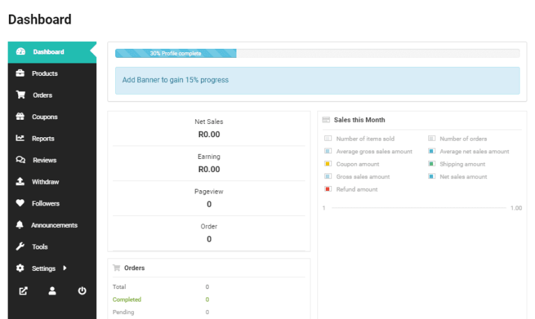6. Congratulations! You are now a vendor on CCS. Your Vendor Dashboard consists of your page statistics and your sales analytics. Here you can see how many people have visited your page, your order statuses and your revenue. On the left-hand side there are tabs that you can navigate through. If you are unsure of the functionality of any of these tabs, then just go to Guides and find the right guide for you (~ ̄▽ ̄)~