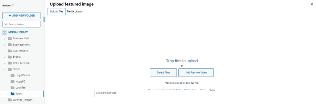 6. When in the “Upload featured image” menu, select your folder (it will have your shop name as the folder title). Click on the “Upload files” tab at the top. Then click on the “Select Files” button. This will open your files menu on your computer/device. Select the file you would like to use as the featured image of your product and then click on “Open”. Wait for the image to upload. The image will be selected automatically. Click on the “Set featured image” button on the bottom right of your screen.