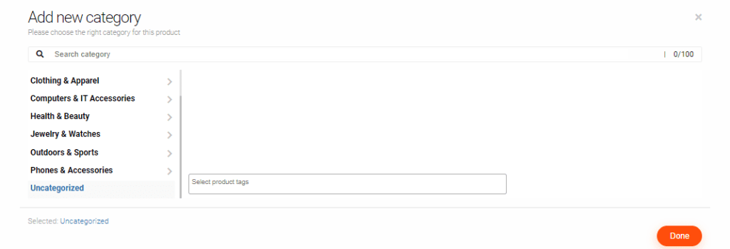9. Select your category and then click on “Done” at the bottom right. If you cannot find an appropriate category for your product, then leave it uncategorized and click the “x” in the top right corner. Alternatively, you can contact us with your category suggestions at: info@centurioncommunity.co.za